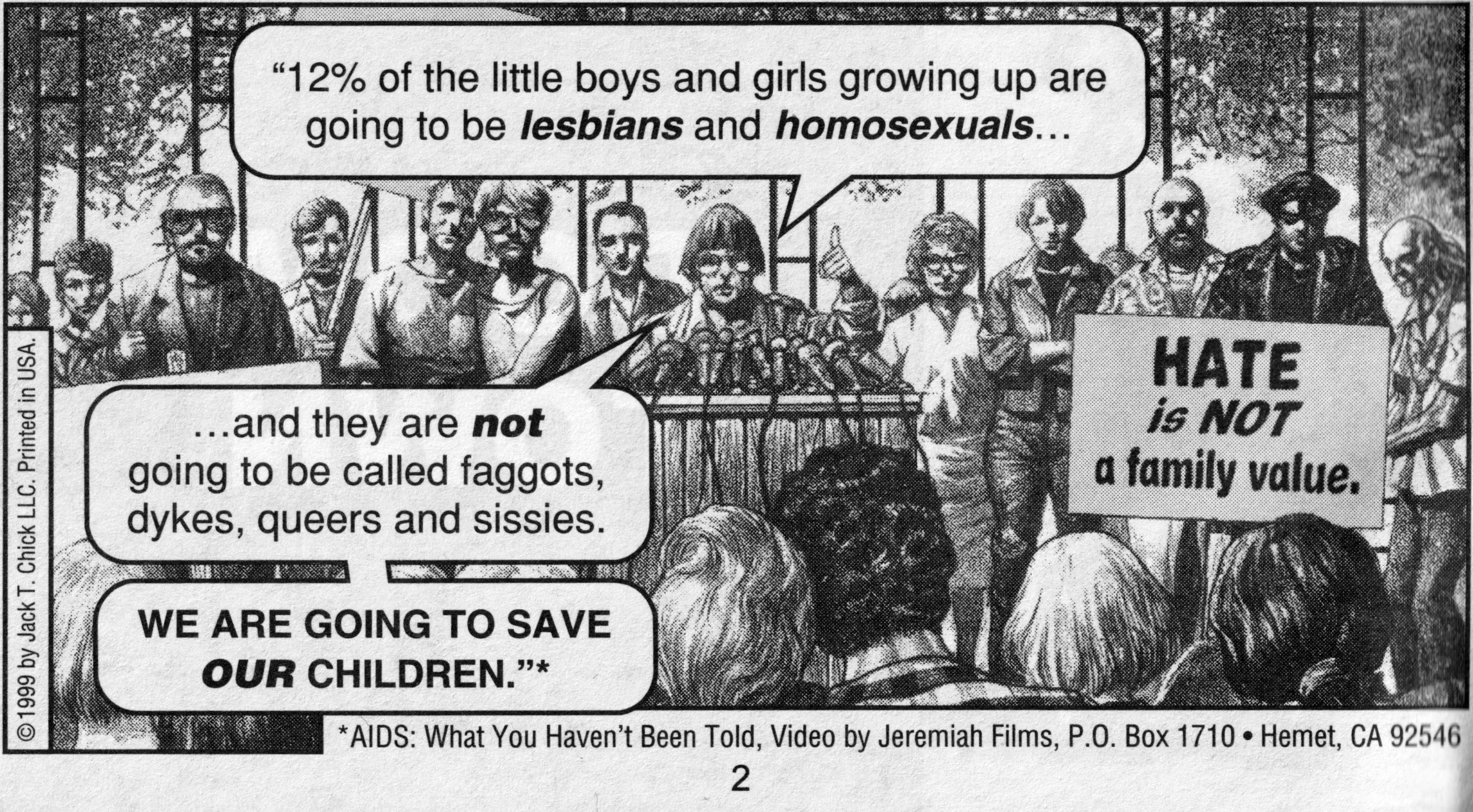 "It's that time again!" We've said it before and we'll say it again. Chick just doesn't understand a damn thing about gay people, and he doesn't care enough to find out. There's the lazy conflation of AIDS and homosexuality, as though they were ALWAYS linked, there's the wildly inaccurate depiction of gay life, and the resolute insistence that gay people have some kind of nefarious agenda whenever they try to have other people respect their rights. Chick's the one with the agenda, one of hate and intolerance for people who disagree with him. And this isn't one that just says "we don't like you", it's political, an agenda shared by many elected officials- officials who ironically insist that "homosexuals control Congress". If lobbying to have laws belatedly passed that say in essence "yeah, I guess we shouldn't persecute you guys so much" means having control of Congress, then I... can't think of a way to end that sentence so that it makes any sense. Sure, it's supposed to be "hate the sin, love the sinner" but just reading the words Chick uses to describe them in the above tract shows the obvious contempt he feels for gay people. It's the same thing with Arabs, Catholics, and pretty much anybody else. The occasional "God loves homosexuals too!" just doesn't outweigh the rest of it. Regarding this tract's treatment of AIDS, with the "blood terrorism" and all that, I'd like to be able to say "it was early, and nobody knew" but A) that's not true, and B) Chick is still peddling the same stuff years later- just look at Uninvited. |