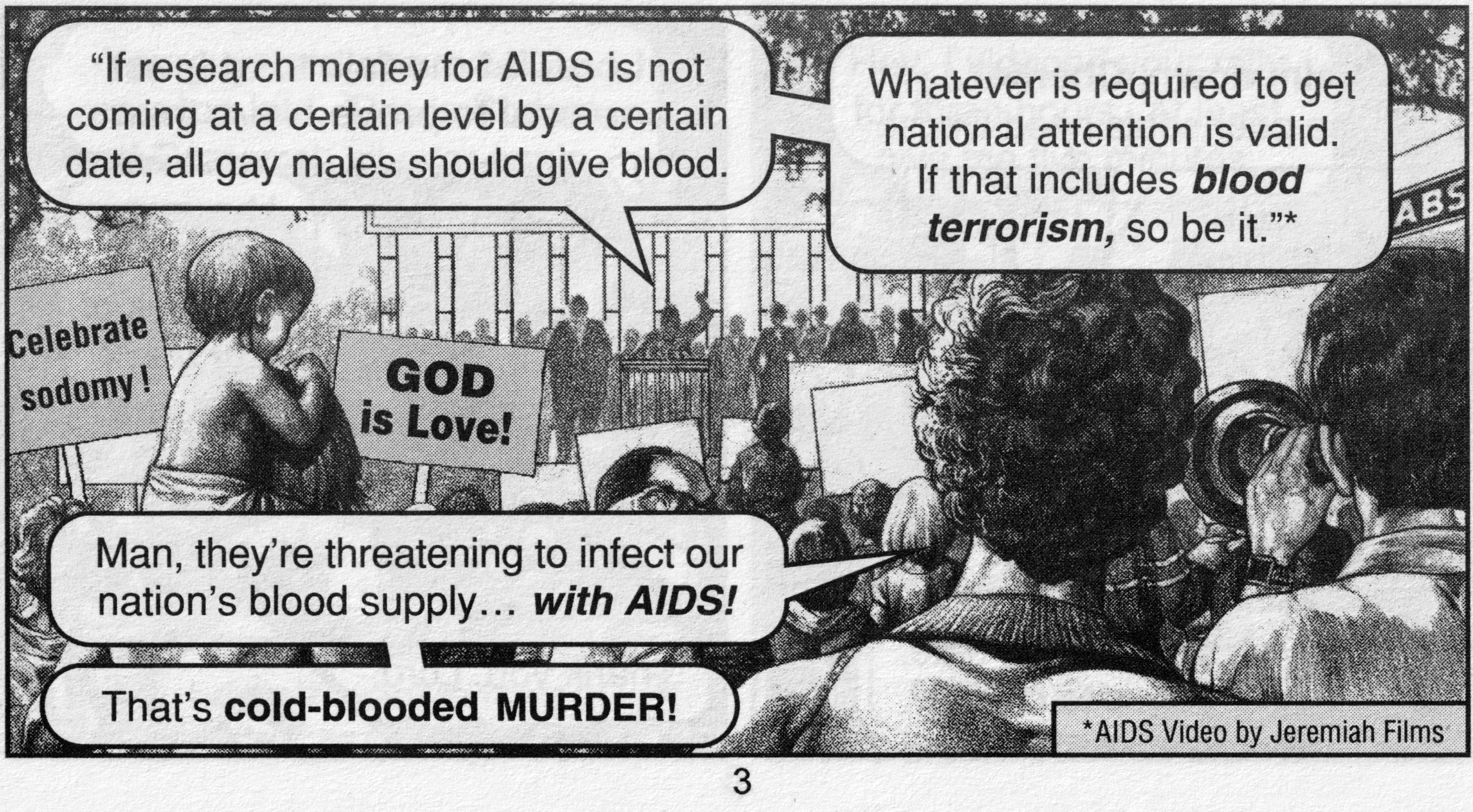 This point has been made in our reviews of other tracts, but just because you are gay it doesn't automatically follow that you have AIDS. And just because you have AIDS, it doesn't mean you are necessarily gay. Gay people can't give blood in America, which goes to show that this sort of fear mongering works. But even if they could, all donated blood is tested, so what's the problem here? |