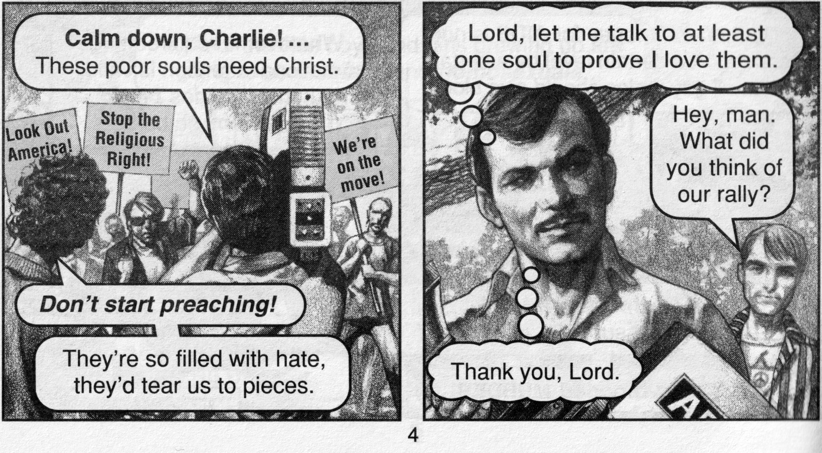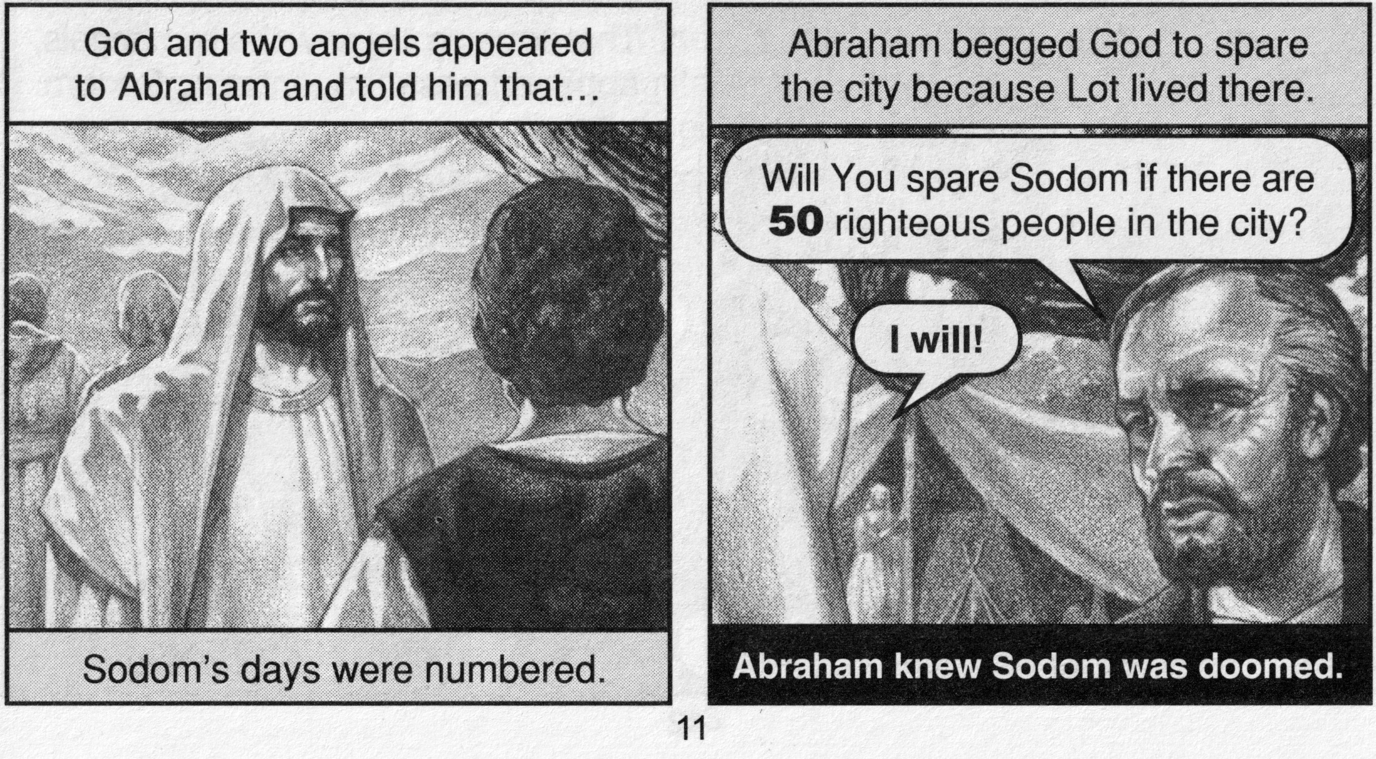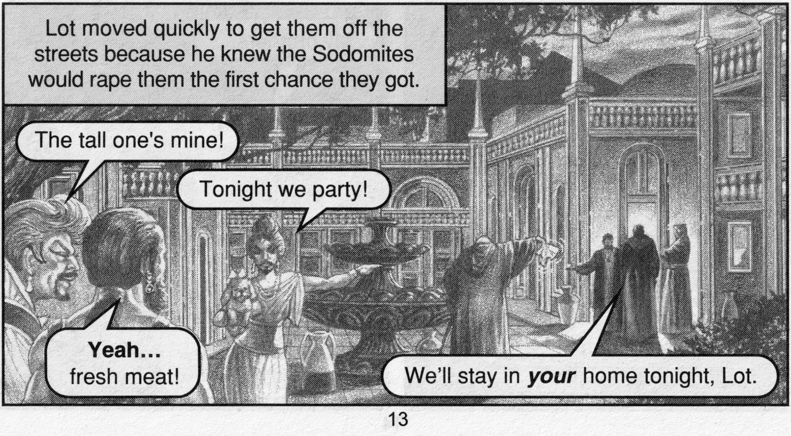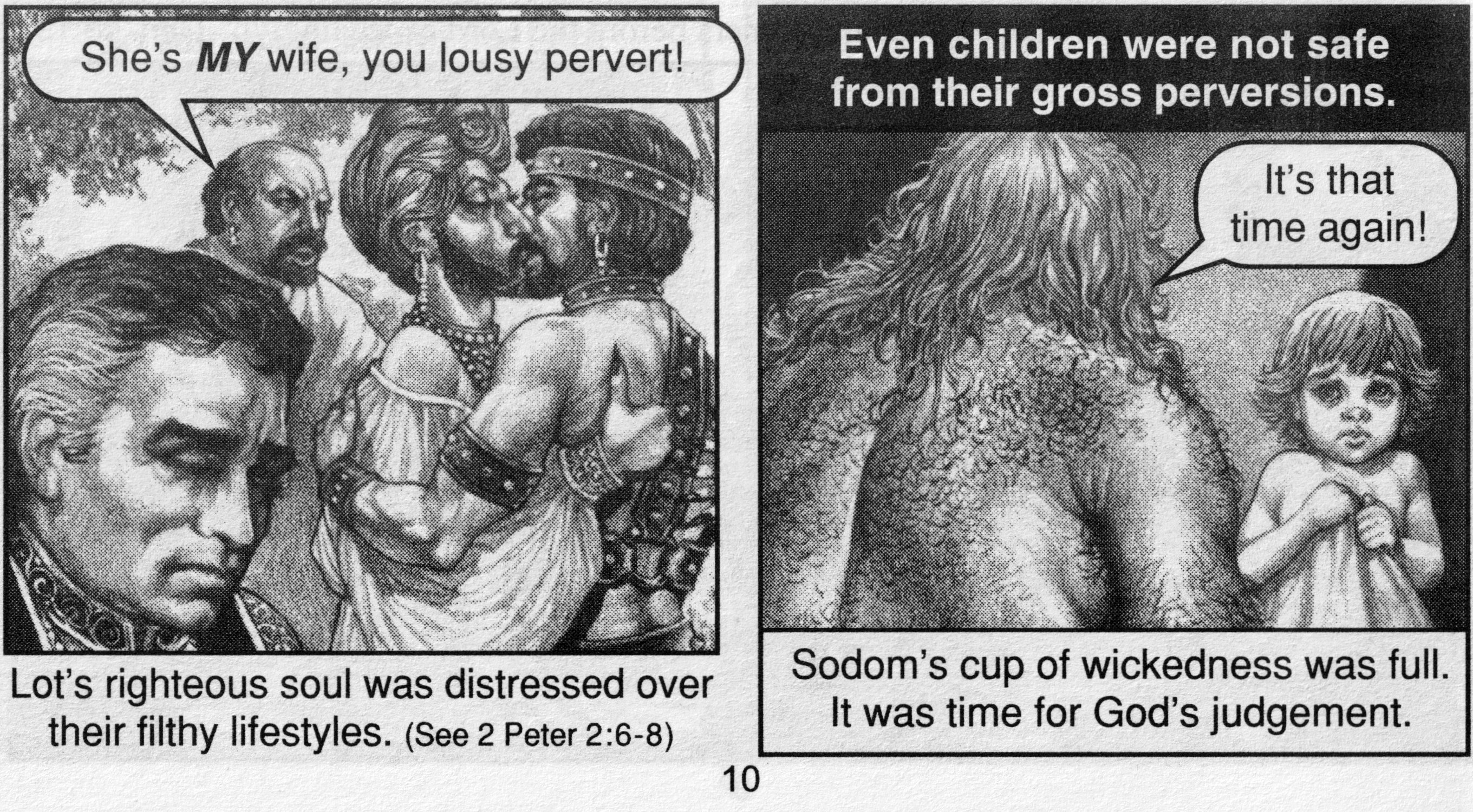 And heeeeere it is, the panel everyone remembers from this tract. "It's that time again!" See, where did this kid come from? Unless the Sodomites work like Kronar, Son of Man ![]() |