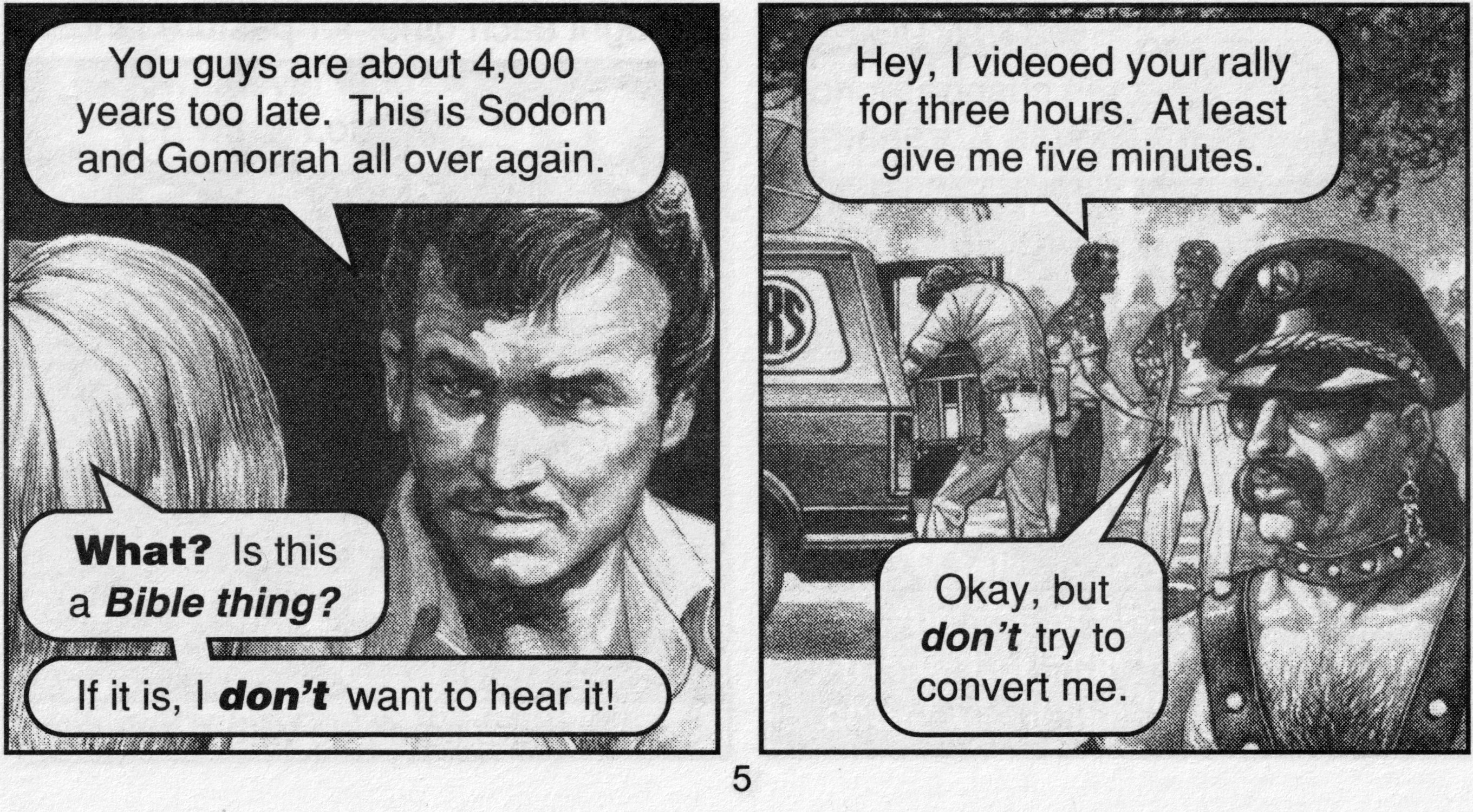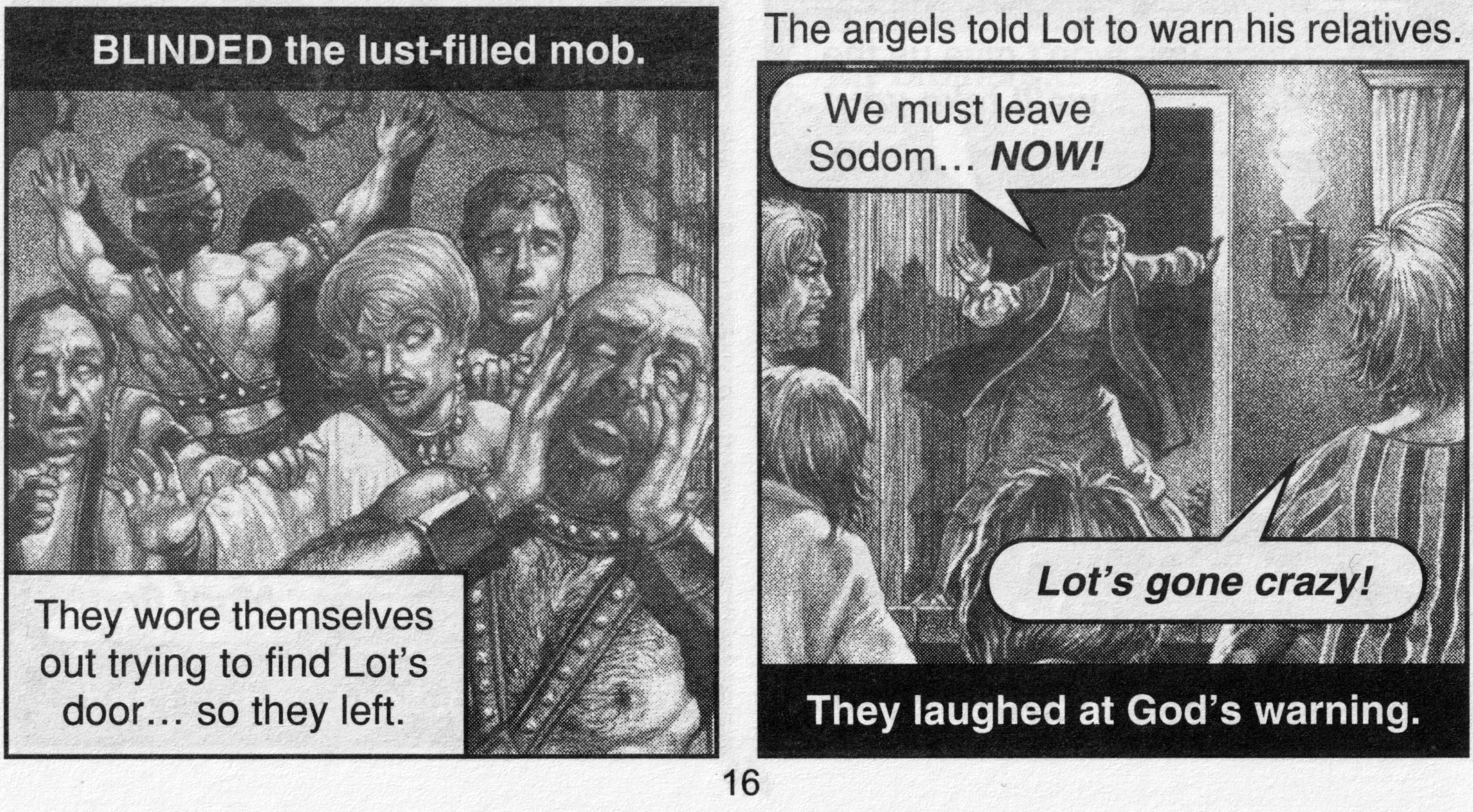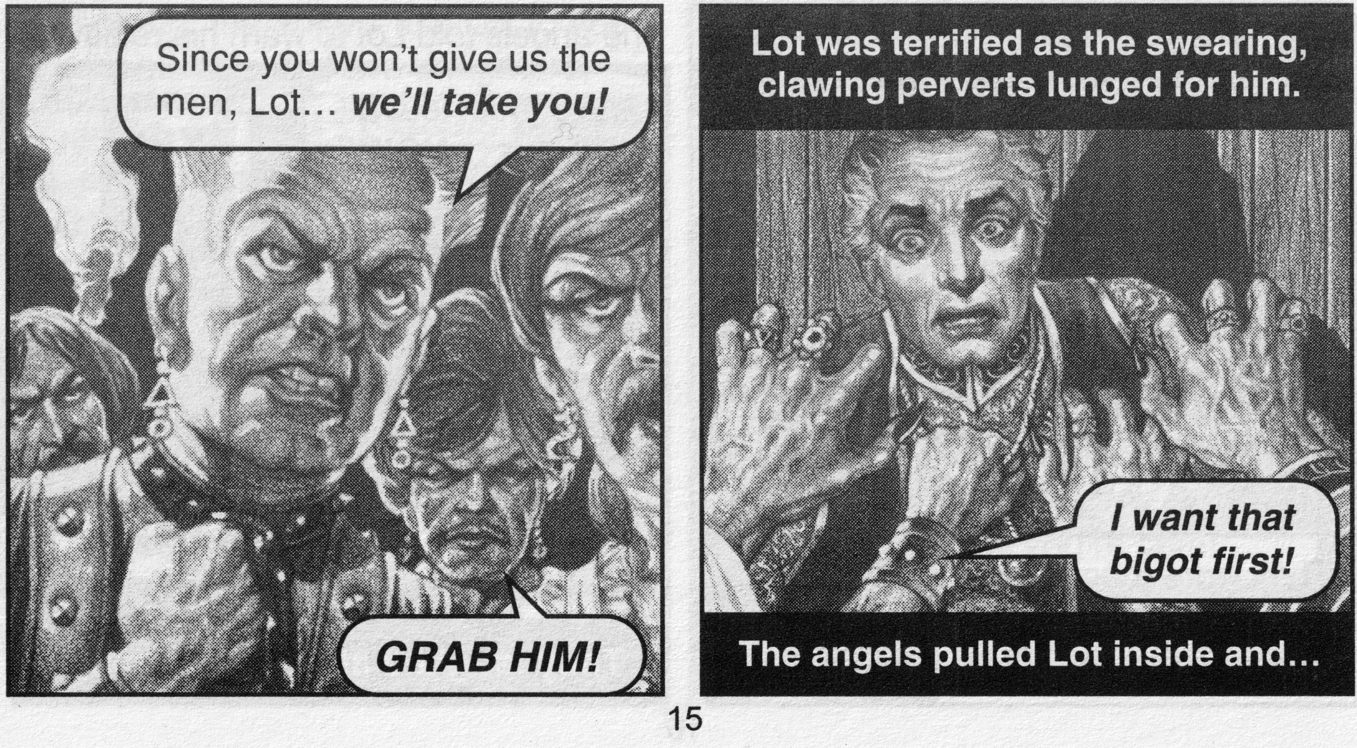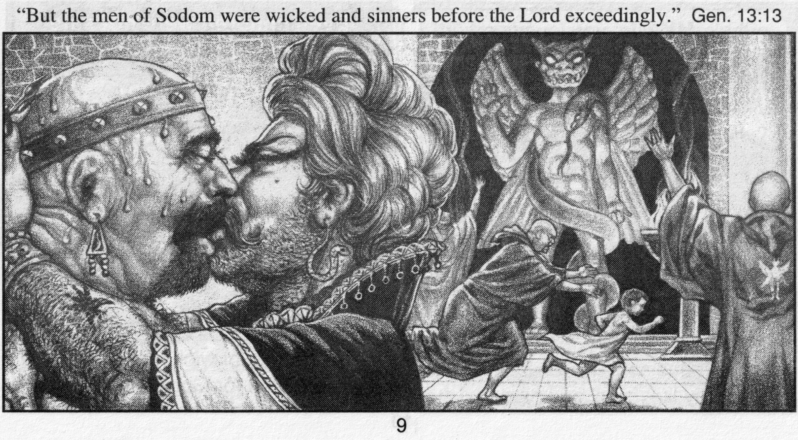I find it hilarious that he compares a peaceful rally championing gay rights to the sordid depiction we are about to see of biblical Sodom. Jack Chick has absolutely NO sense of scale. |