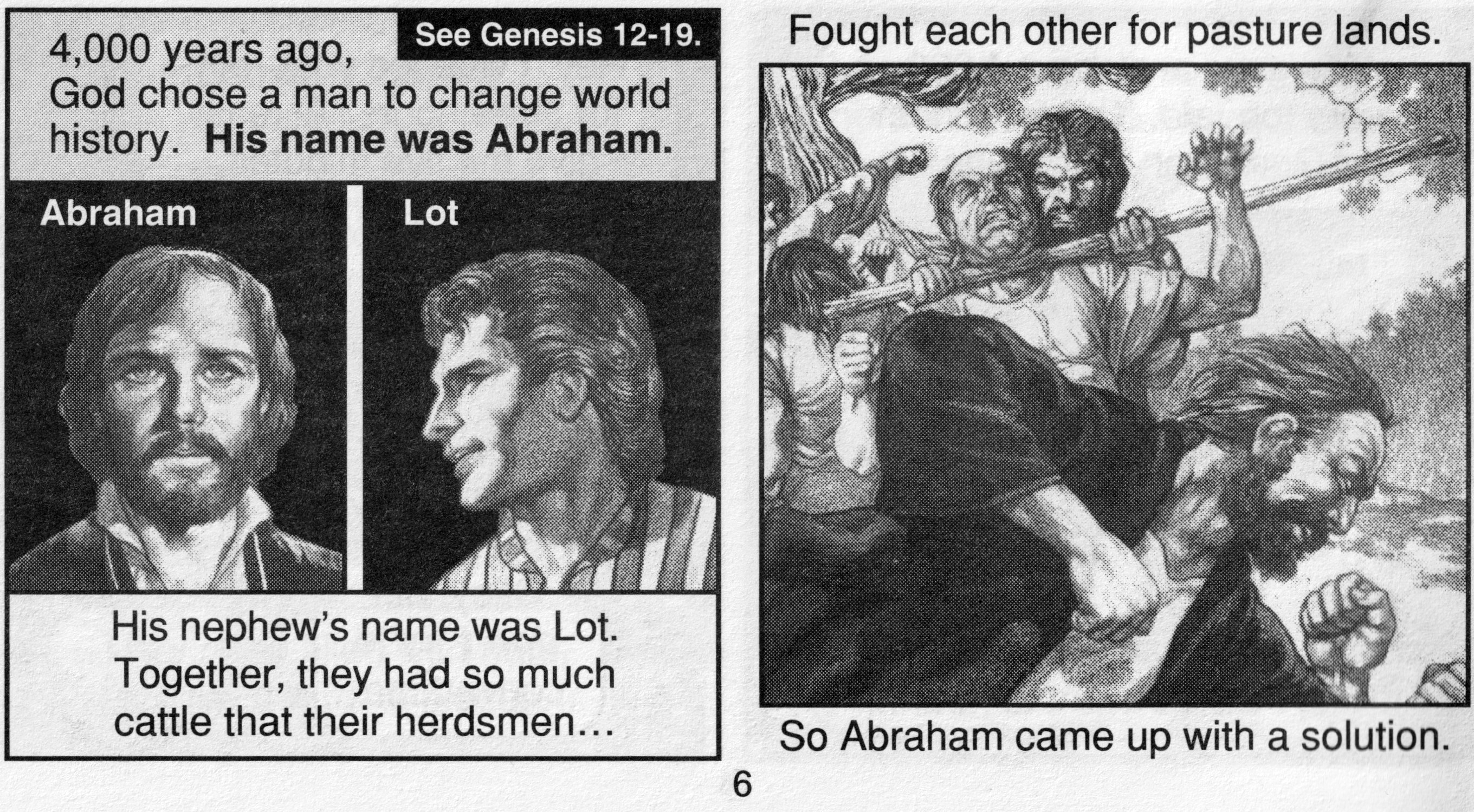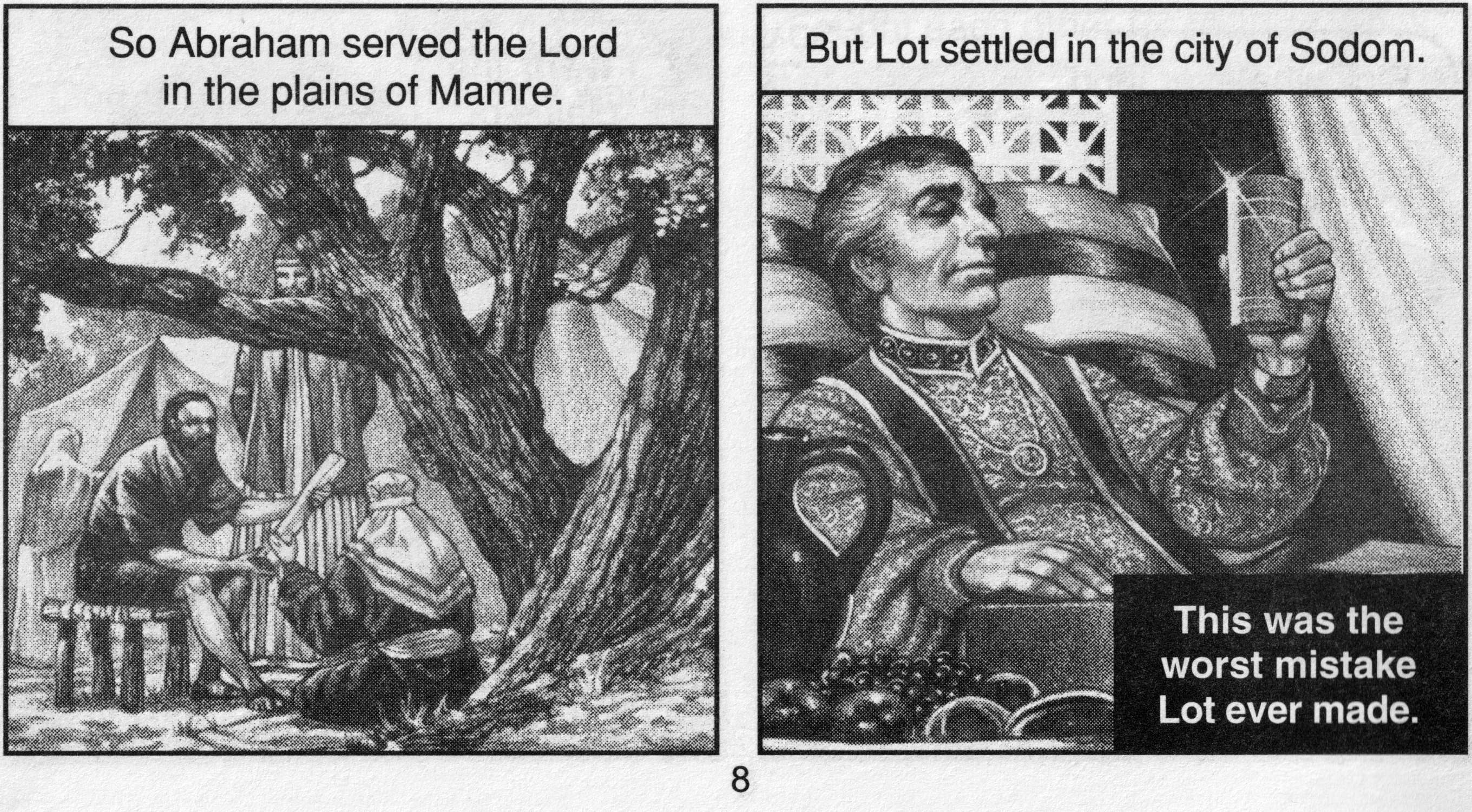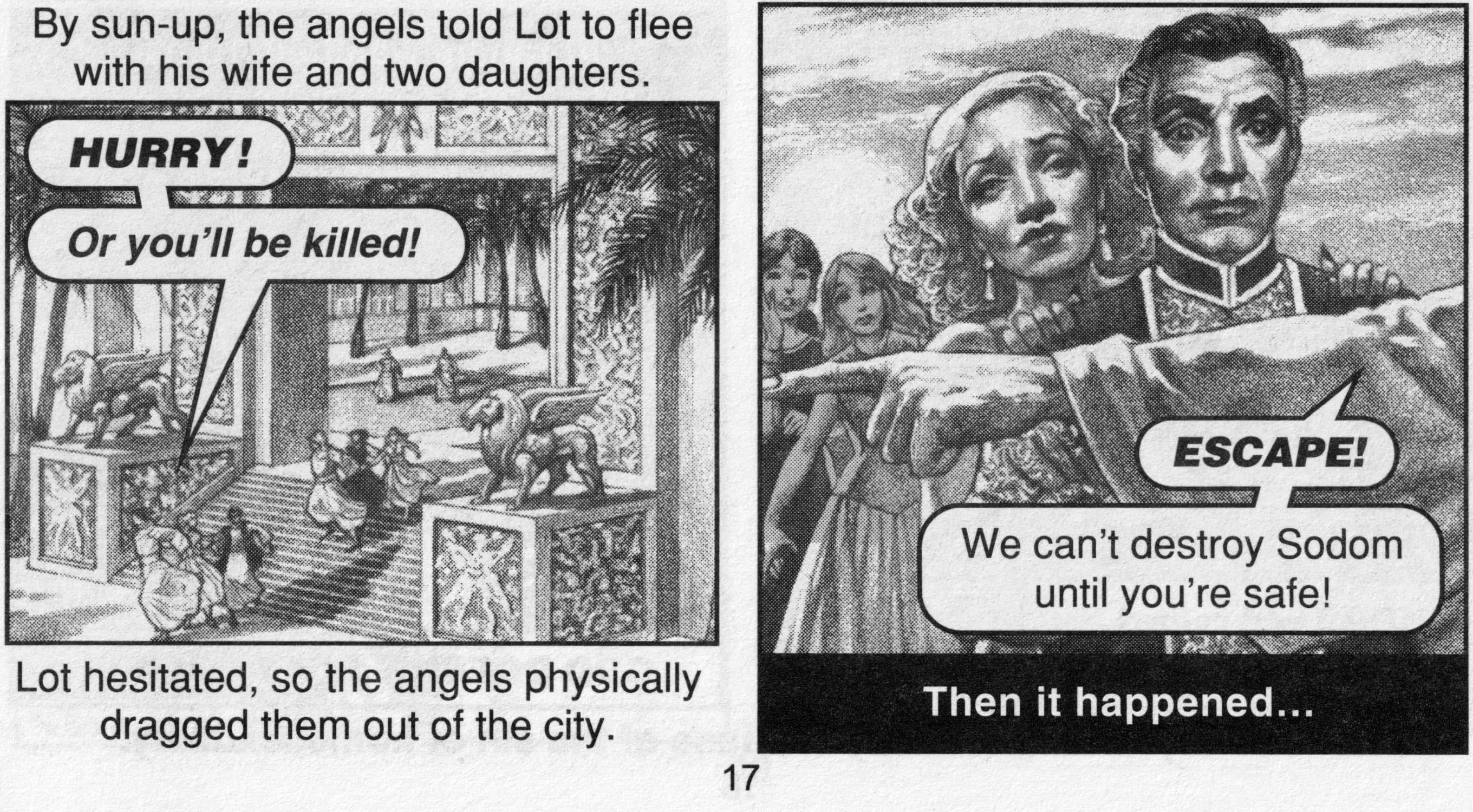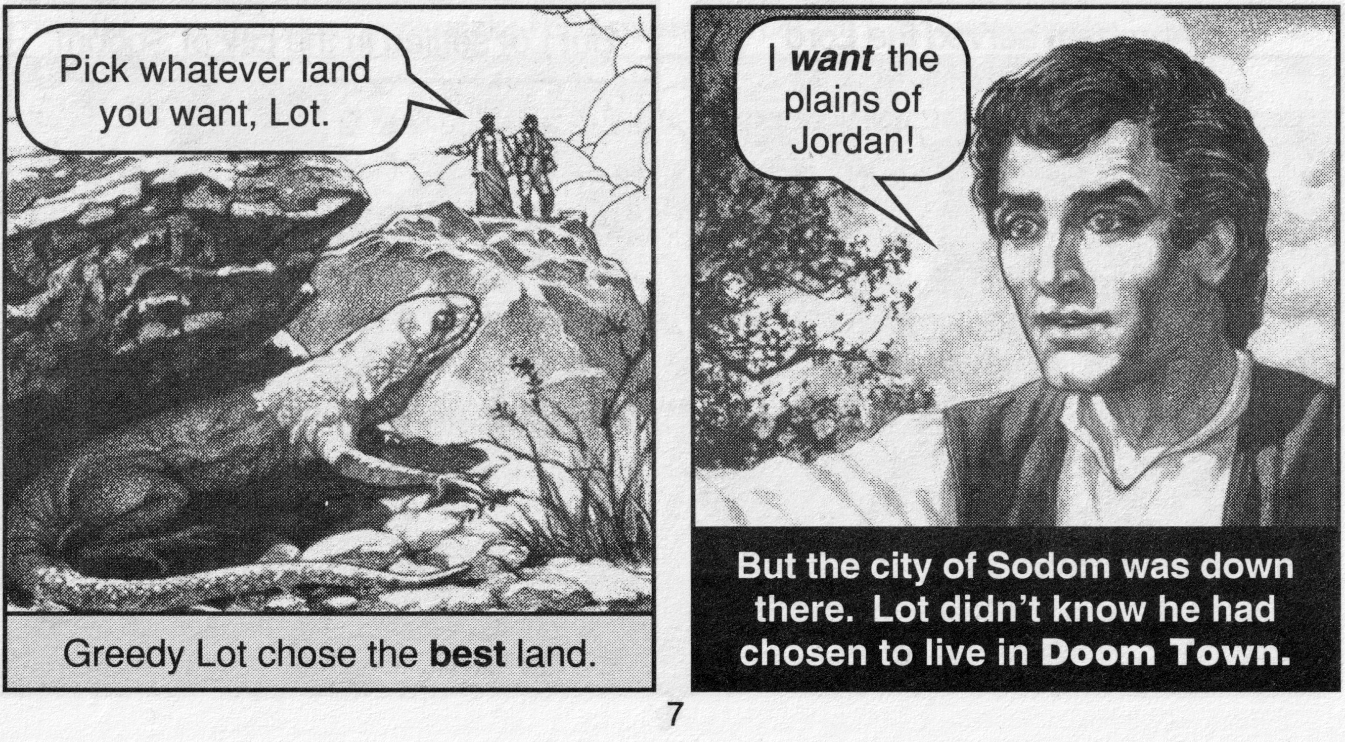 This illustrator seems to rely heavily on movie references. His Moses, for example, looks like Charlton Heston in the 1956 version of The Ten Commandments. In this tract, Lot is clearly Stewart Granger in The Last Days of Sodom and Gomorrah. This has the unintended effect of badly dating Mrs. Soon-to-be-a-salt-pillar's hairstyle. |