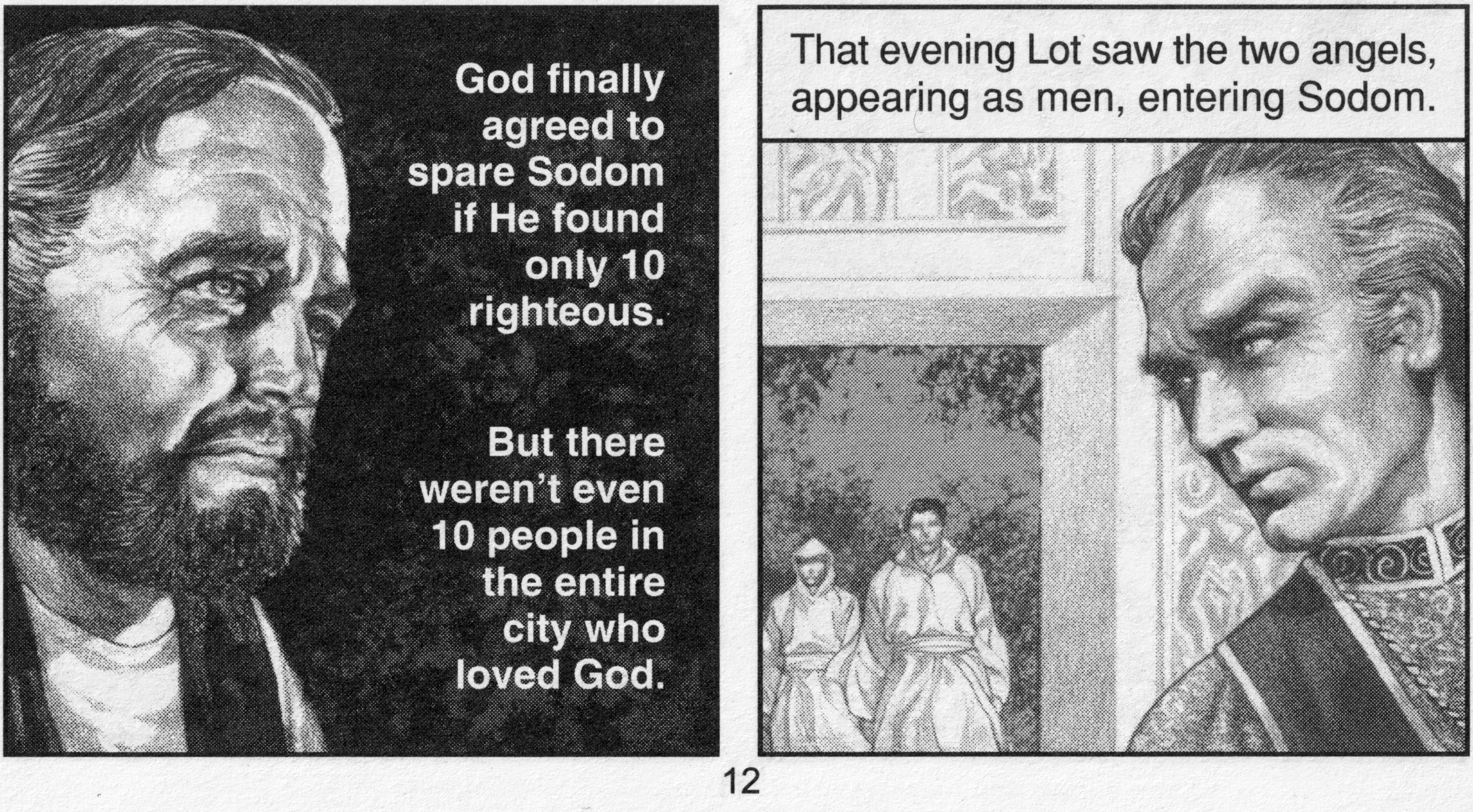 Yeah, the use of photo references helps to make the drawing look more realistic. But unfortunately they come so close (but not close enough) that they topple right into the Uncanny Valley, so Lot and his wife look like plastic action figures rather than real people. Each sold separately. Collect the whole set! And coming soon the Incinerated Sodom™ playset! Lighter fluid not included. |