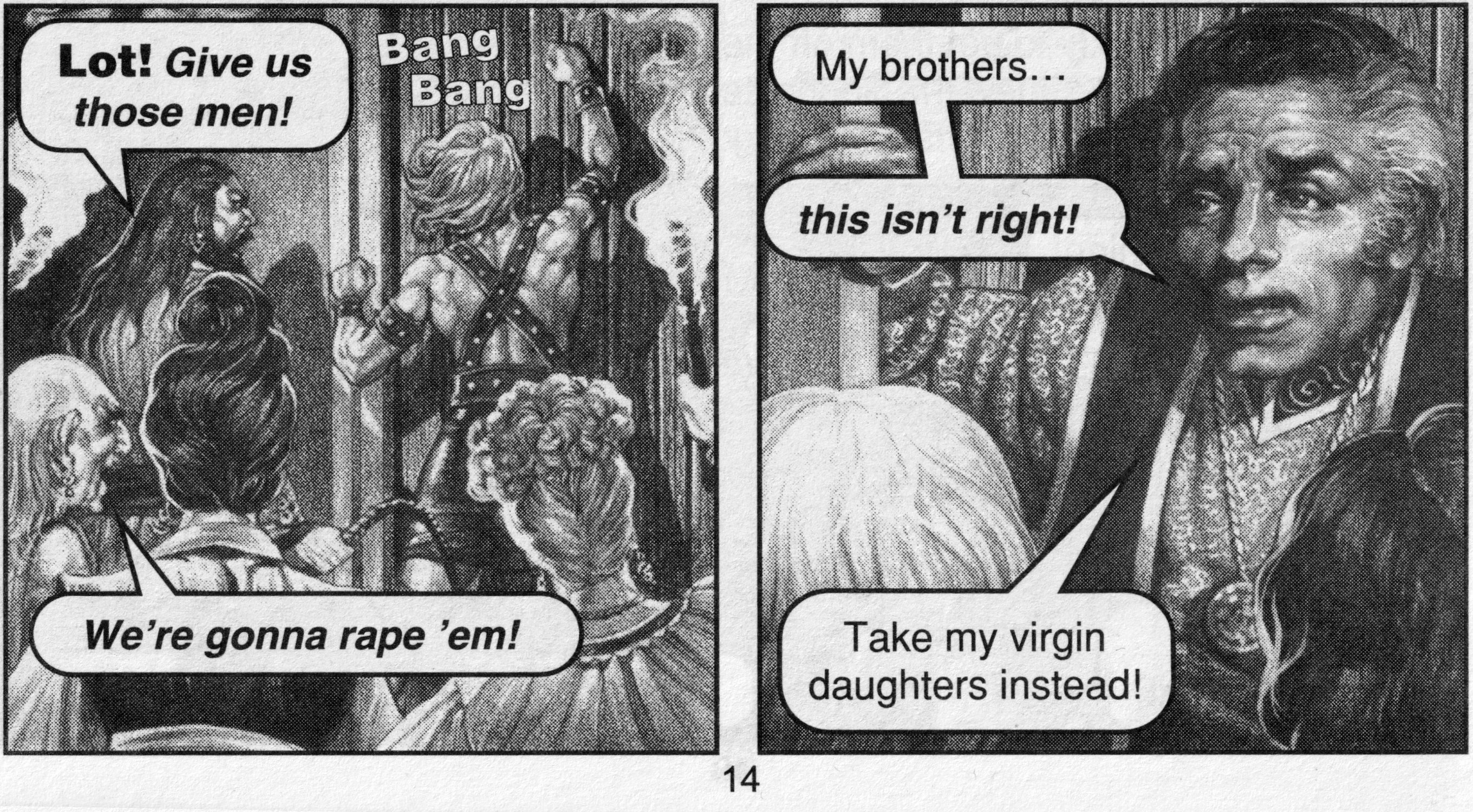 ...and this always passes without comment. "Here, rape my virgin daughters!" One of the cases where the morality of characters in Bible stories is inconsistent with so called "Biblical morality". Yeah, I'm sure Biblical literalists can spin it, but that's just fucked up. |