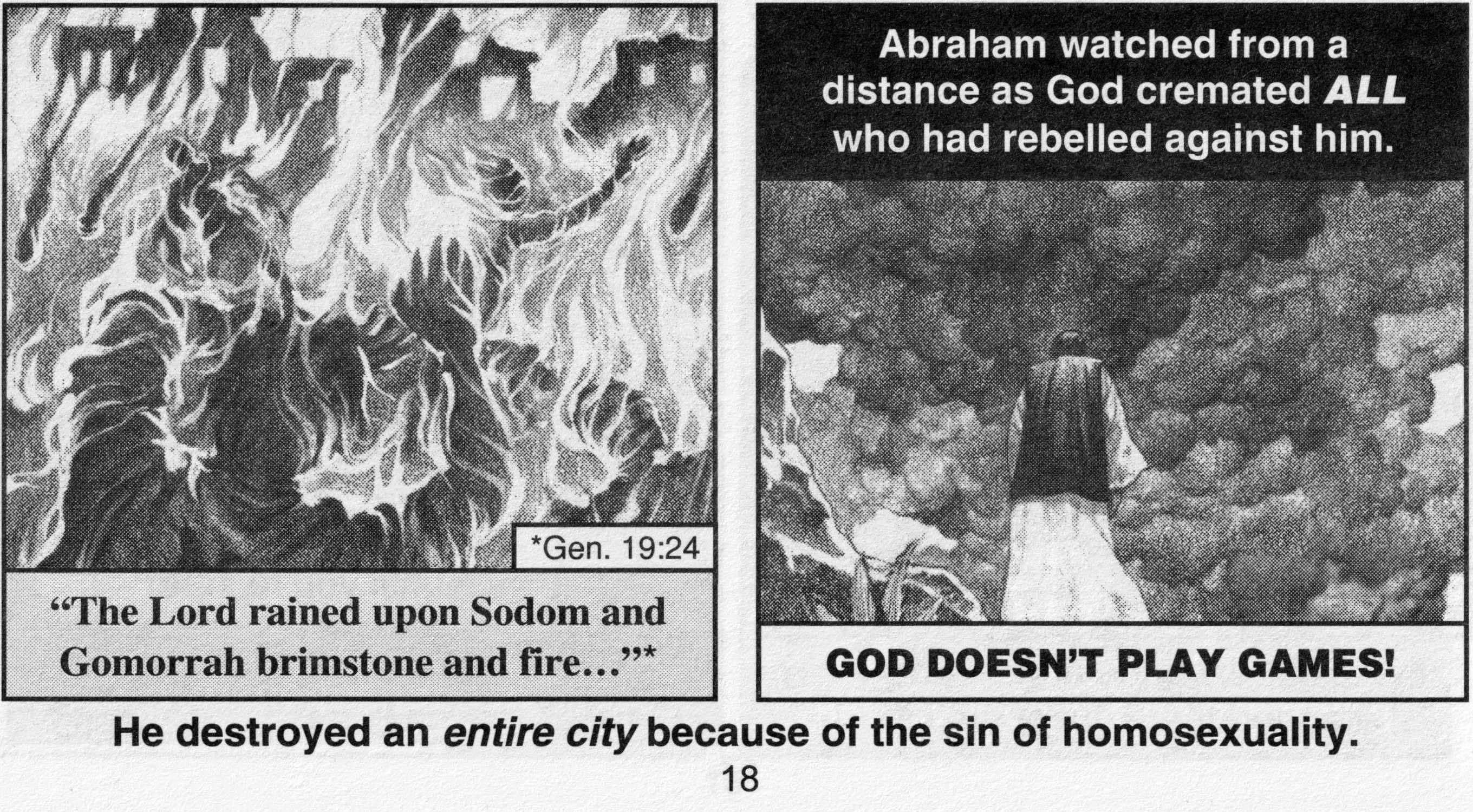 Well, it's been said that God does not play dice with the universe... but I thought that was just because he prefered Parcheesi. I guess God's just a serious stick in the mud. No fun at parties. I find it interesting that Chick and others like him really stress this point- that Sodom was destroyed just for homosexuality, and God never destroyed another city for the same reason. If one buys into this mode of thinking, it leaves open the question of why God doesn't destroy, say, San Francisco (I know its a stereotype, but for Chick, all stereotypes are always true), or maybe Las Vegas (which people actually call Sin City, you know, like a city founded and dedicated to sin.) But only Sodom got that treatment. |