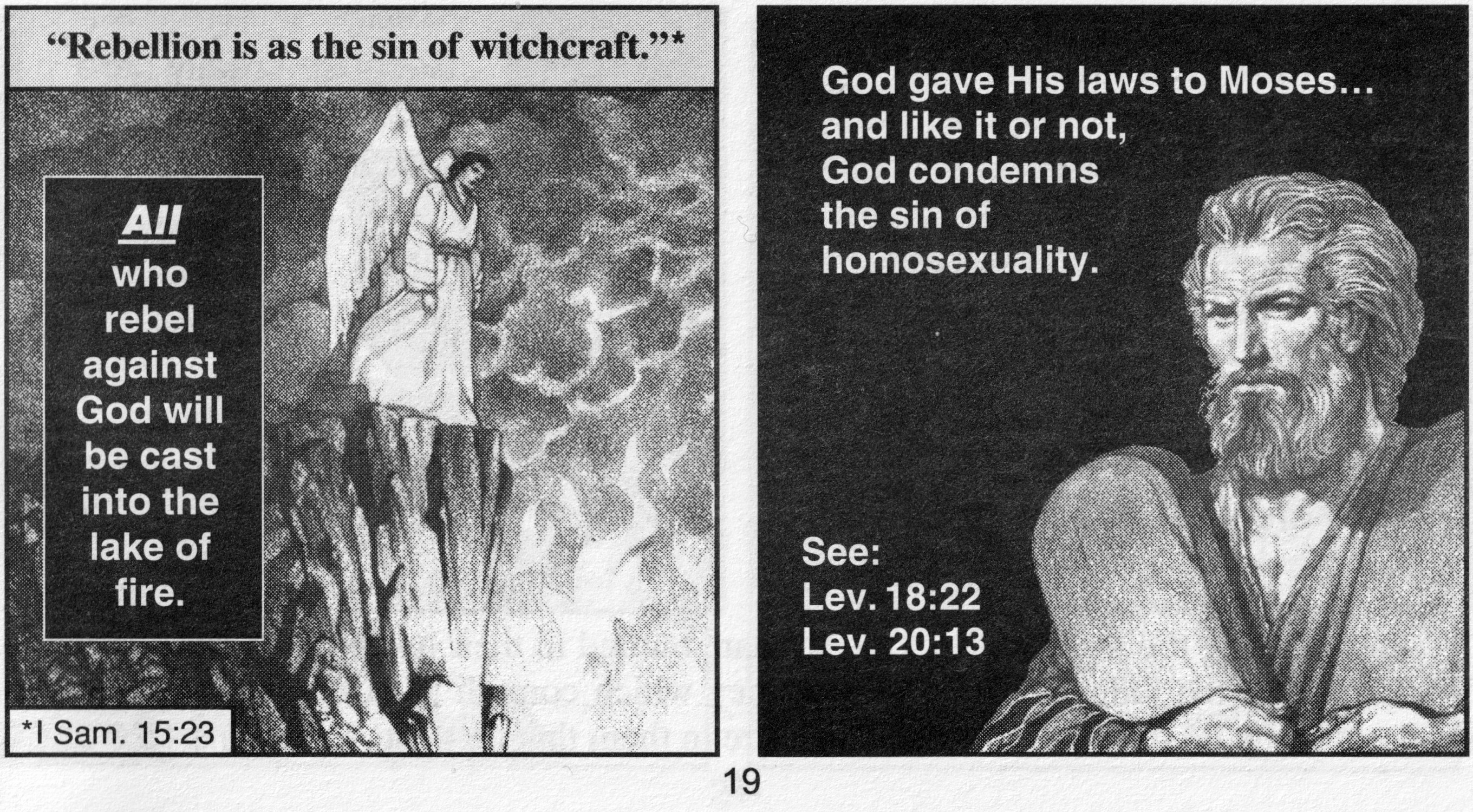 Yeah, and here's So wait, now homosexuals are rebellious? And then rebellion is like witchcraft, so that means homosexuals are like witches. Somewhere our syllogism has broken down. |