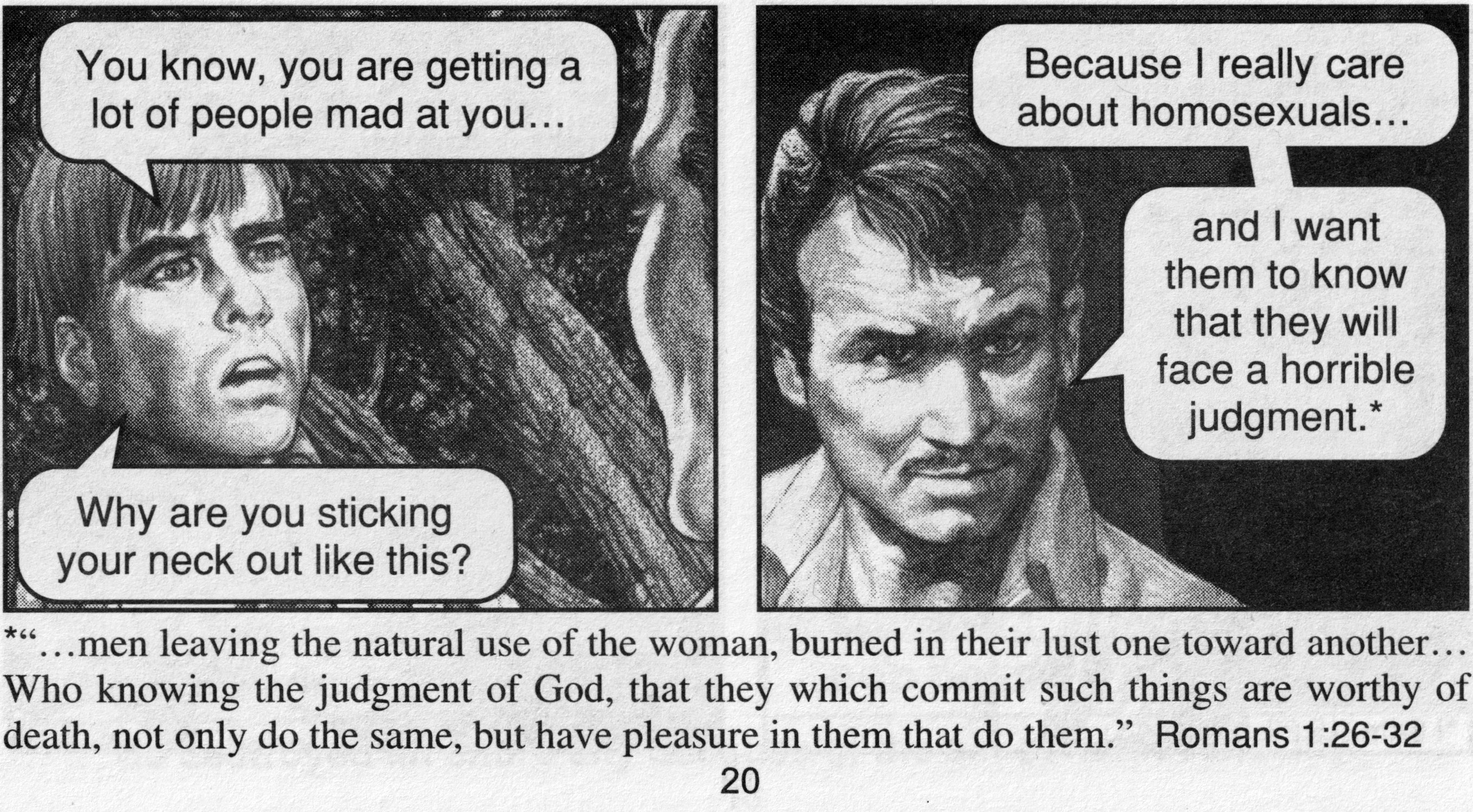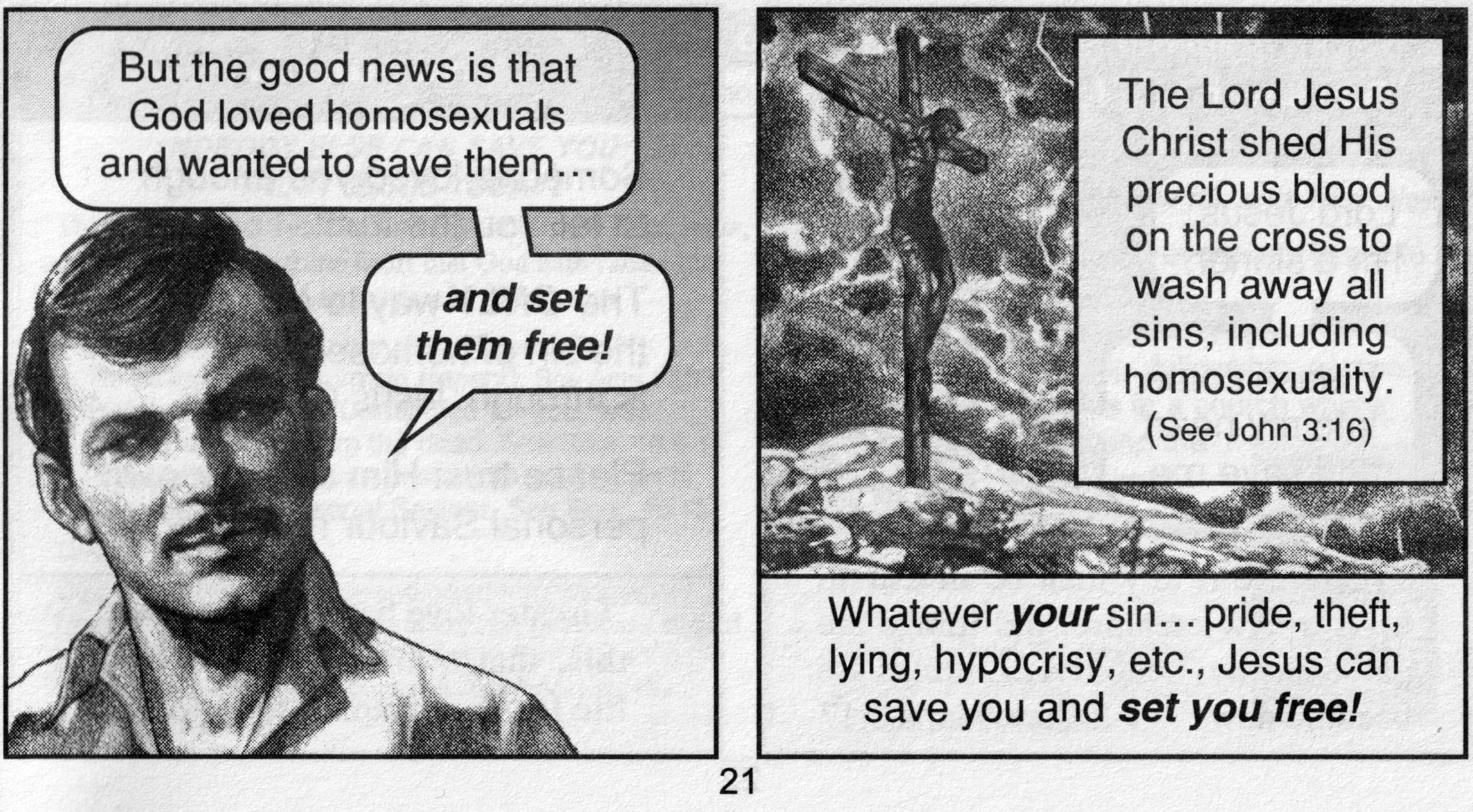 Set them free from what? Did it ever occur to you that gay people might be happy, and perhaps even proud, of their orientation? Just because you think being attracted to or loving someone with the same junk as yourself is icky doesn't mean the whole world thinks like you do, nor are they obligated to. Also, this is an exact copy of the second panel on Page 4 with the background cut out. They didn't even bother to mirror it this time. |