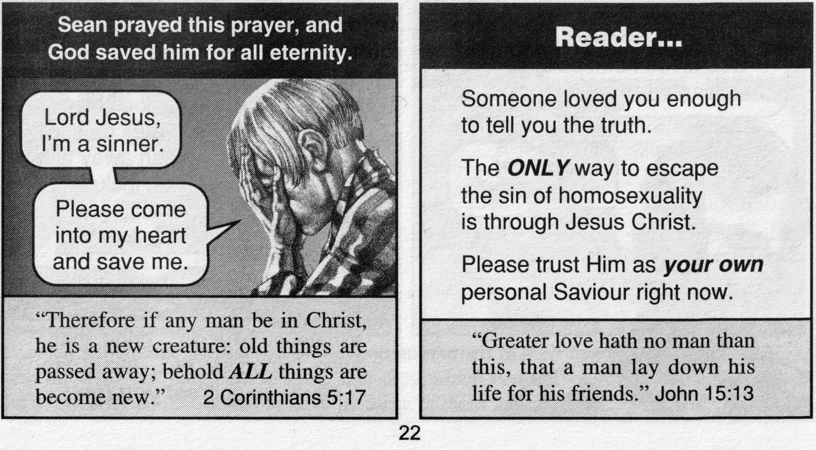 Whee! It's just that easy! "Escape the sin of homosexuality" with prayer. That'll make it all better! |