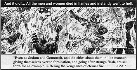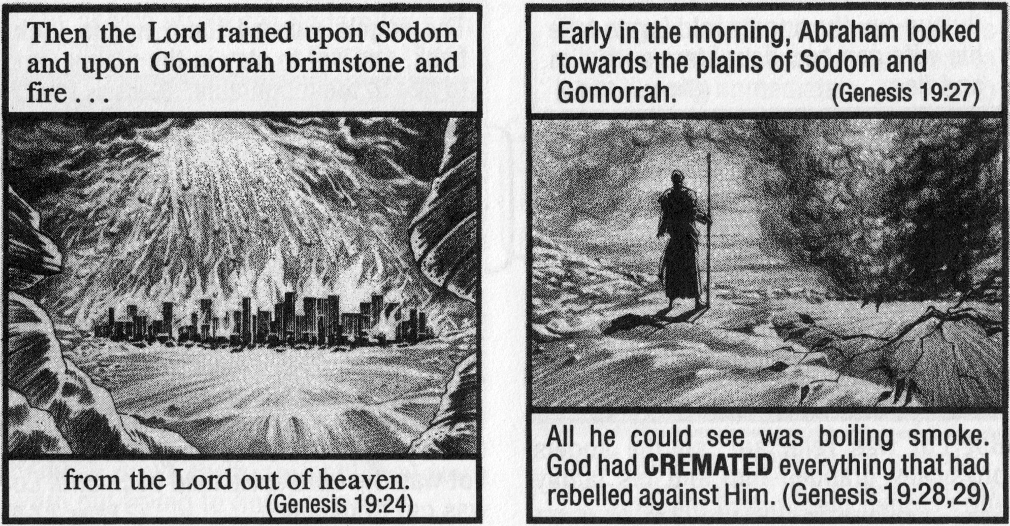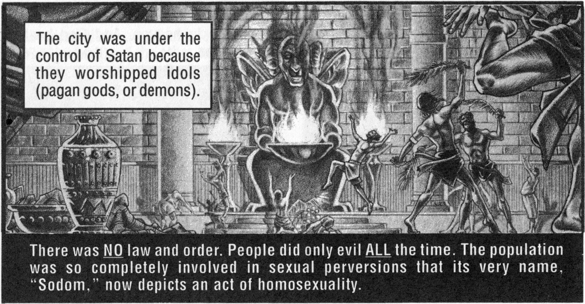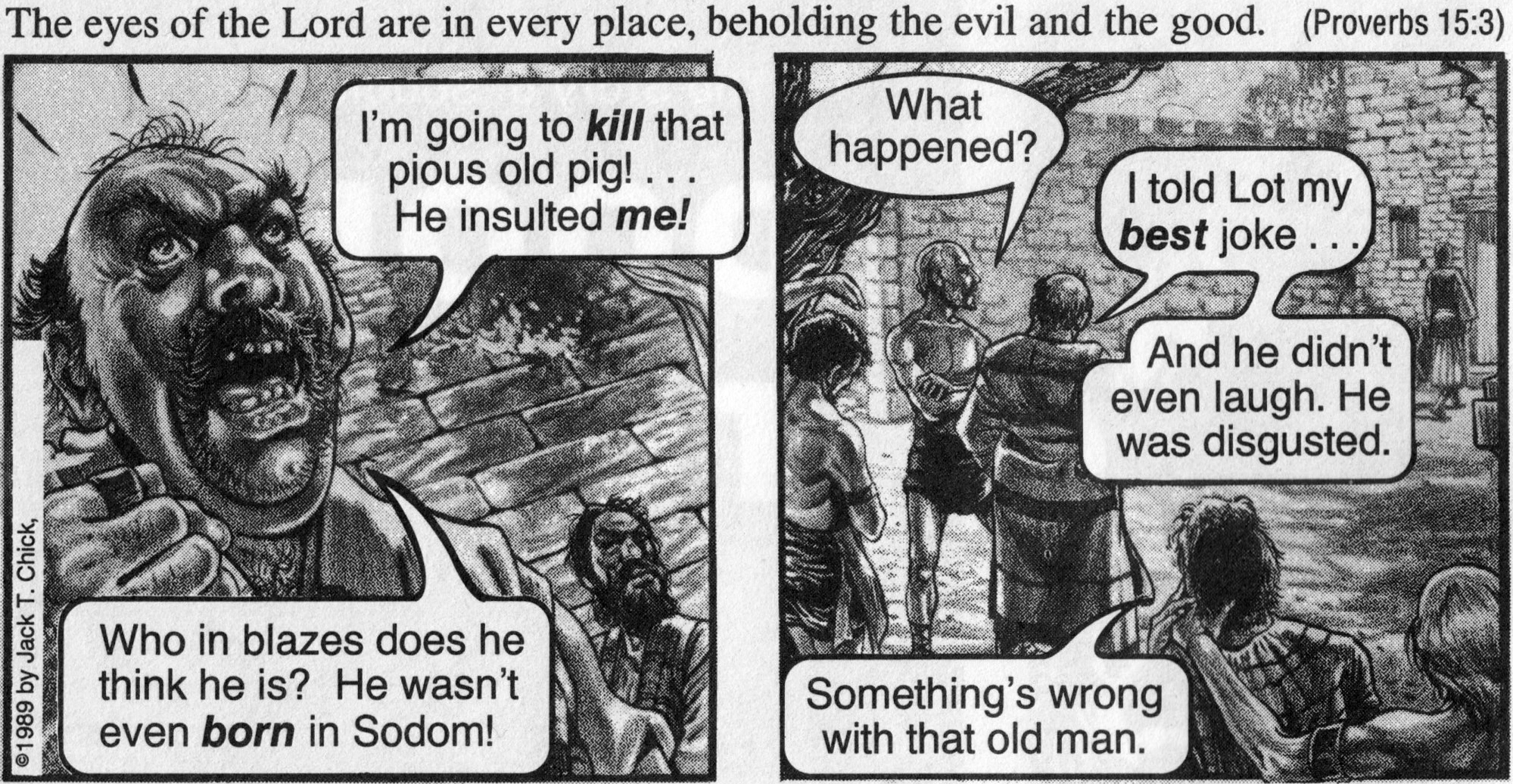 | Genesis 18:20 does not say anything about child molestation - just that they have committed grievous sins. Dredging my earlier point, what exactly are their grievous sins at this point in the Genesis narrative? It is never clarified at all. It could be their lack of helping the poor and needy and poor hospitality rather than this angle you push, Chick, especially since you include a reference to 2 Peter 2:6-8 in the revision of this tract. And do you notice the lack of certain words? Such as 'homosexuality' and 'sodomy'? Instead it says things like 'ungodly', 'wicked' and 'unlawful deeds'. Which are able to be applied to actions like 'lying' and 'false witness'... words that I can say may be applicable to you.