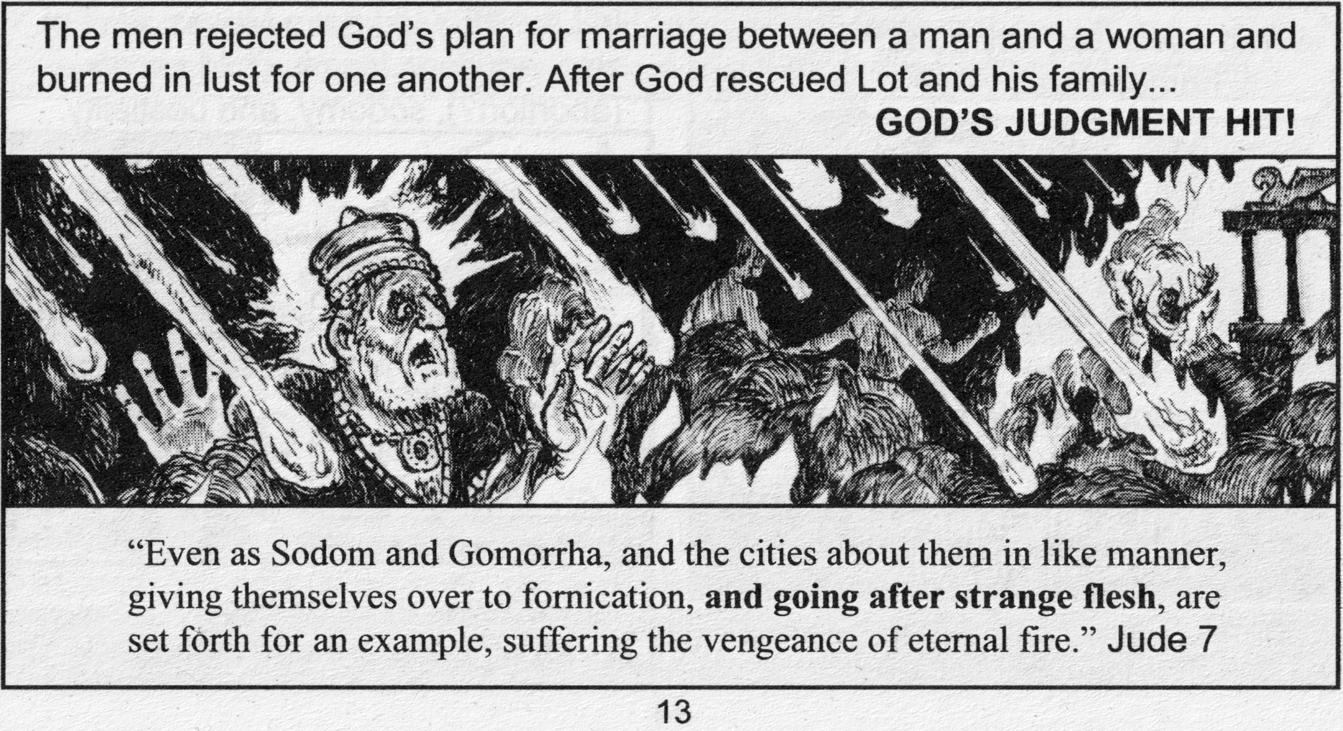 You also point to Genesis 13:13, but there isn’t any mention of what exactly makes Sodom wicked and full of sinners, if you read from the start of Genesis up to this point. It does not say anything about their supposed sin and wickedness until the incident involving the angels. Please kindly forgive me if I choose to express cynicism that the individual and associated company who wrote tracts like Lisa, Wounded Children and Home Alone? might not be one hundred percent honest in their statements and twist things to suit their fearmongering agenda to push corrupted and perverted drivel to try to scare people. |